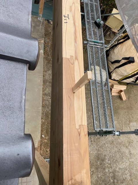 BLOG 2026.02.06 金輪継の梁 以前ブログでご紹介しました最強過ぎる継手「金輪継(かなわつぎ)」桁や梁といった横架材を継ぎ合わせる際に用いられる伝統工法です。作業場で手刻みにて加工した梁が、リフォーム現場の玄関の梁に!込栓(こみせん)を打ち込んでしっかりと固定しています。込栓に使用する木材は、一般的に樫(かし)や欅(けやき)を用いります。